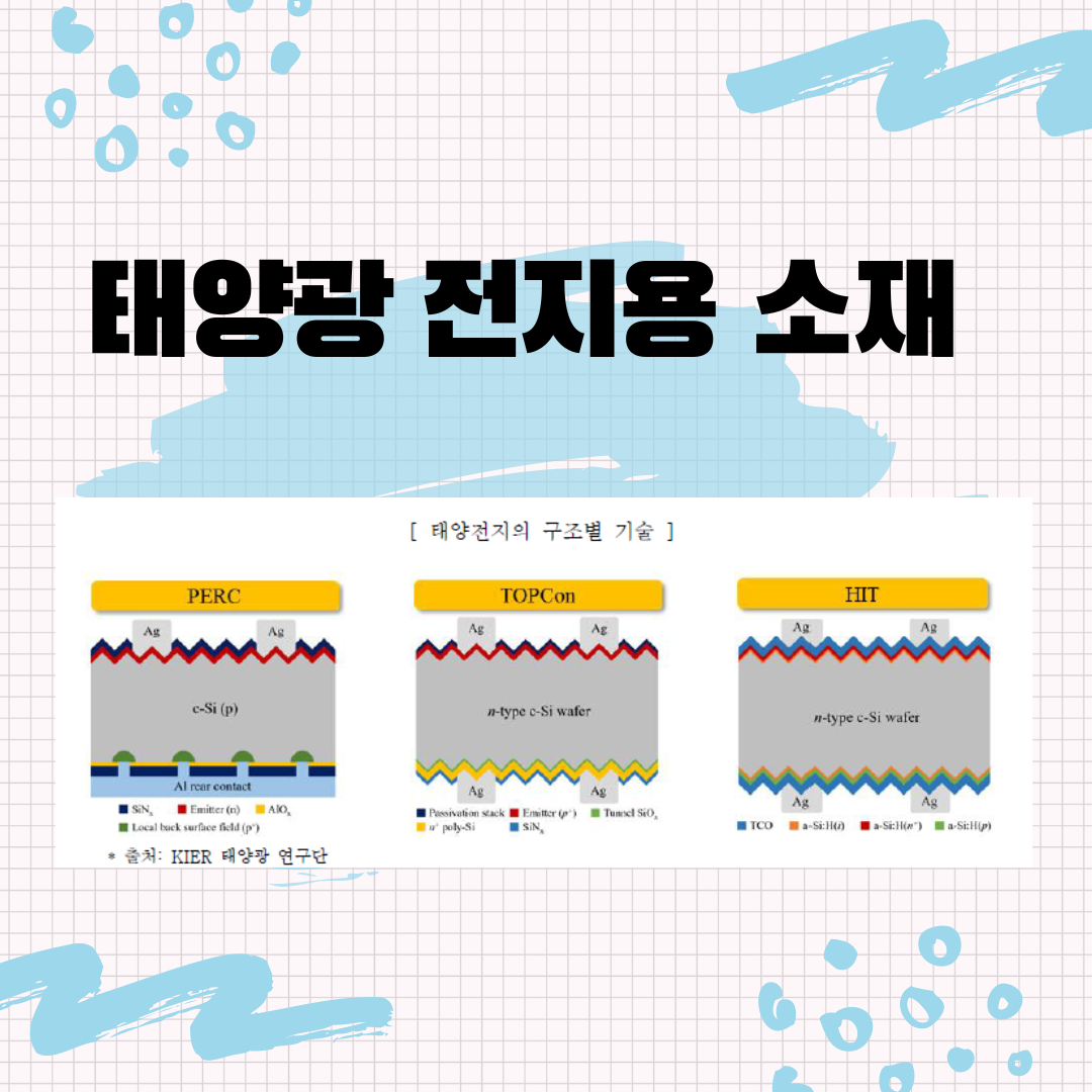 이번 주제에서 다룰 소재는 크게 3가지로 나눌 수 있습니다. 고효율 태양전지용 미세선폭 소재, 다결정 실리콘 웨이퍼, 외장필름으로 크게 나눌 수 있습니다. 산업화 속도의 증가로 에너지 사용량이 급격히 많아졌습니다. 그 결과로 온실 가스의 배출 또한 크게 늘게 되어 지구 기후 변화문제는 갈수록 심각해지고 있습니다. 화석에너지가 고갈되고 국제적인 환경 보호 이슈의 해결책으로 탈 탄소 정책 등이 쏟아지고 있습니다. 그중 비중이 큰 정책은 신재생에너지 사업이 되겠습니다. 에너지 정책상 2035년까지 글로벌 신재생에너지의 비중은 40% 정도로 예상됩니다. 대한민국 정부는 재생에너지 비중을 30% 이상으로 증대시키는 로드맥을 발표했으며 재생에너지의 목표치를 설정하였습니다. 주요 소재인 미세선폭 소재에 대해서 알아보겠습니다. 전계에 의해 분리된 전자 등이 재결합되도록 외부 회로로 전달하며, 전력의 효율성을 높인 적극을 말합니다. 태양전지의 특성상 태양 빛을 많이 흡수해야 에너지 효율이 좋아지게 됩니다. 관련해서는 전압손실을 줄이는 것이 중요한 목표이기도 합니다. 현재 상용화된 기술로는 단결정 실리콘을 이용한 태양전지가 가장 큰 비중을 차지하고 있습니다. 원가비용의 절감을 위해서는 다양한 공정들이 시도되었으며 스크린 프린터를 기반으로 하는 페이스트라는 혼합물을 인쇄하여 형성됩니다. 태양전지의 특성상 제어와 미세화 공정을 위해서는 이 스크린 인쇄용 페이스트와 마스크 재료 개발이 산업의 핵심이 되겠습니다.