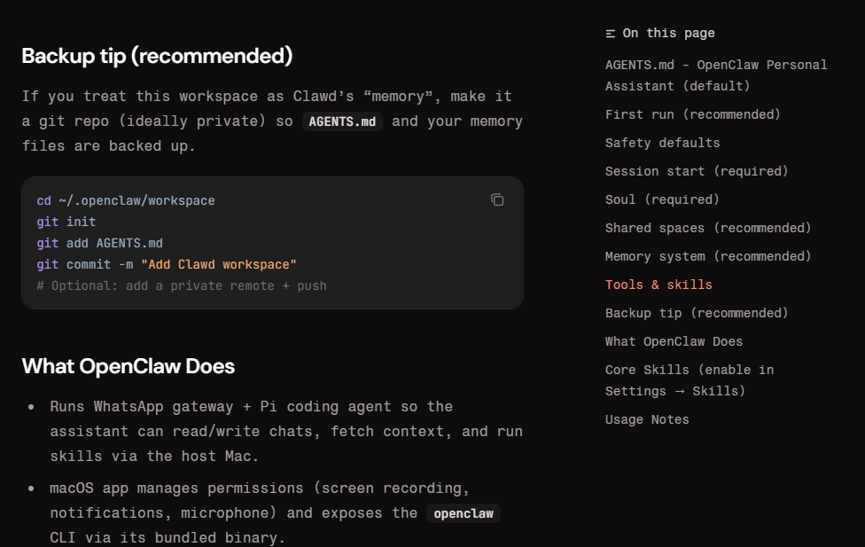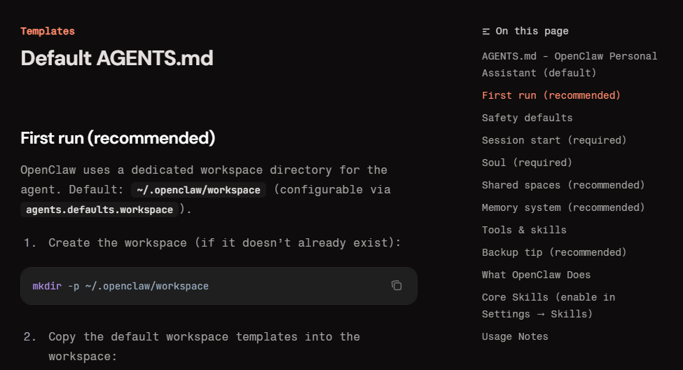~/.openclaw/workspace/)에 일반 마크다운 형식으로 저장됩니다. 복잡한 코딩 문법 없이 자연어로 작성해도 에이전트는 찰떡같이 이해합니다. Git 등 버전 관리 시스템에 올려 이력을 관리하는 것도 좋은 방법입니다. 📎 OpenClaw 공식 문서(Agents → AGENTS.md) 원문 보기 →