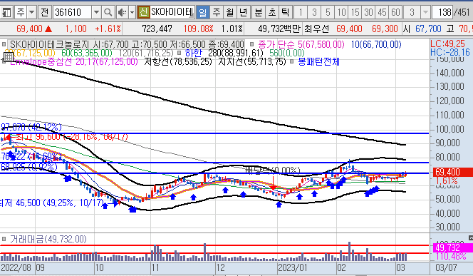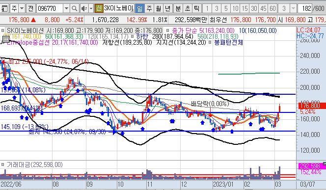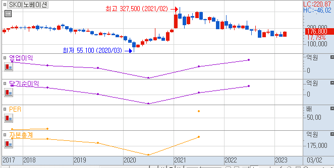 기업소개 : SKIE Technology는 SK Innovation의 자회사로, 2차 전지의 핵심 부품인 분리막 생산을 전문으로 합니다. 이 회사의 분리기는 전기 자동차 및 에너지 저장 시스템을 포함한 다양한 응용 분야에서 사용됩니다. 최근 2차 전지 섹터로 자금이 몰리며 다른 양극재 소재 주식으로 자금이 이동하며 SK아이이테크놀로지의 주가는 하락하는 추세였습니다.