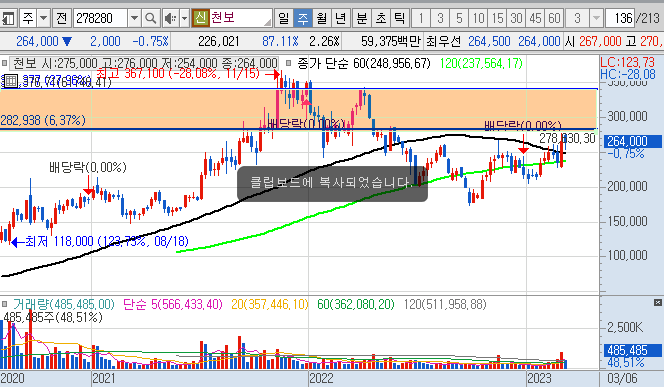 차트분석 : 천보 또한 직전 고점의 매물대를 소화시켜 다음 시세를 노려볼 기회가 생기겠습니다. 아래의 주봉 차트를 보면 연간 이평선을 이미 뚫고 올라오는 모습을 보여주고 있습니다. 잠시 숨 고르기 이후 상승 추세를 이어 나갈 수 있을 것으로 보입니다.