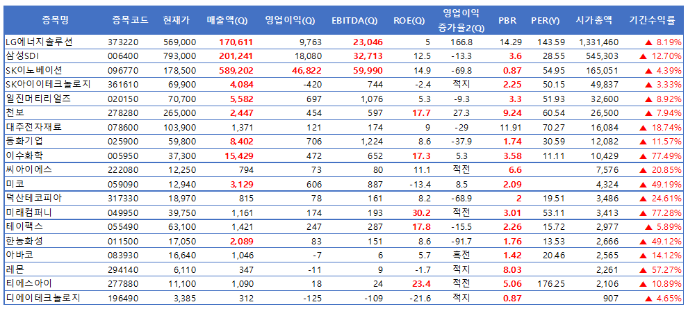 종목 소개 순서는 시가총액 상위 종목을 순서로 소개드립니다. 어느 주식에 투자할지 고민된다면 시가 총액 상위 주식에 투자하라는 말이 있습니다. 하지만 무지성 매매를 예방하기 위해 투자 안내를 드리겠습니다. 소개드리는 2차 전지 관련주식들은 최근 바닥을 다지는 종목들로 선정되었기 때문에 급등하는 2차 전지를 투자하지 못한 분들에게 도움이 될 것입니다.