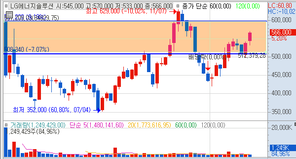 기업소개 : LG 에너지 솔루션은 LG 화학의 자회사로 세계 최대의 2차 전지 제조업체 중 하나입니다. 이 회사는 전기 자동차, 에너지 저장 시스템 및 기타 응용 분야용 배터리를 생산합니다. LG화학에서 분사하여 상장된 이후 상장 당시의 기관투자자들의 매도 물량이 많았으며 이 물량들이 악성 물량이 되어 상장일 당시의 고가를 기점으로 상단이 막힌 채 하락추세로 전환되었습니다.