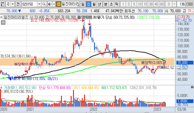 기업소개 : 일진머티리얼즈는 전극 소재, 세퍼레이터, 전해질 등 이차전지 생산에 사용되는 다양한 소재를 생산합니다. 그 회사는 또한 반도체와 디스플레이 패널과 같은 다른 산업을 위한 재료를 생산합니다. 일진머티리얼즈는 주가가 상승하지 못하고 있는 실정이나 많은 기관투자자들이 고평가 되어있다고 판단했습니다. 하지만 아래 6번째 사진인 실적 추정 예상치를 점검해 보면 23~24년에 실적이 대폭 개선될 전망입니다.