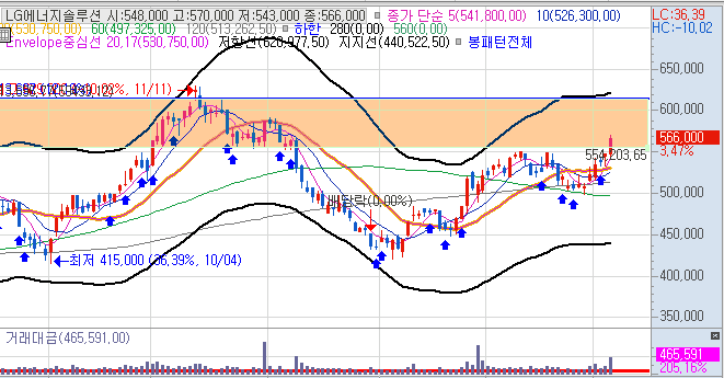 기업소개 : LG 에너지 솔루션은 LG 화학의 자회사로 세계 최대의 2차 전지 제조업체 중 하나입니다. 이 회사는 전기 자동차, 에너지 저장 시스템 및 기타 응용 분야용 배터리를 생산합니다. LG화학에서 분사하여 상장된 이후 상장 당시의 기관투자자들의 매도 물량이 많았으며 이 물량들이 악성 물량이 되어 상장일 당시의 고가를 기점으로 상단이 막힌 채 하락추세로 전환되었습니다.