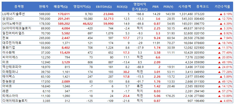 종목 소개 순서는 시가총액 상위 종목을 순서로 소개드립니다. 어느 주식에 투자할지 고민된다면 시가 총액 상위 주식에 투자하라는 말이 있습니다. 하지만 무지성 매매를 예방하기 위해 투자 안내를 드리겠습니다. 소개드리는 2차 전지 관련주식들은 최근 바닥을 다지는 종목들로 선정되었기 때문에 급등하는 2차 전지를 투자하지 못한 분들에게 도움이 될 것입니다.