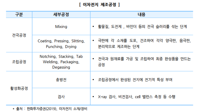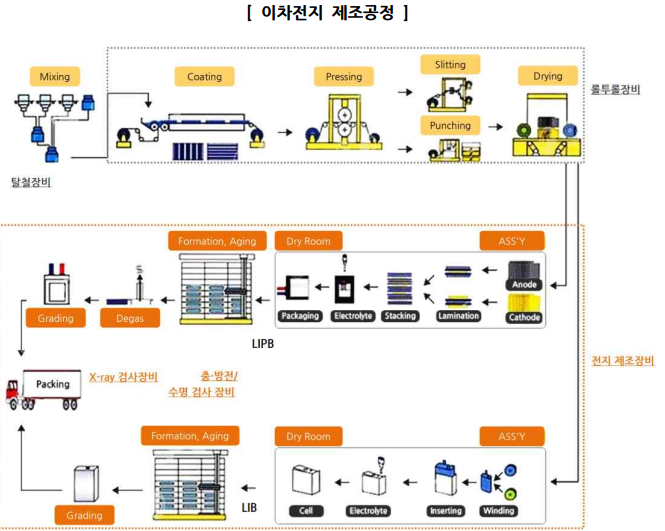 제조 공정에 필요한 장비 장치로서 전극, 조립, 활성화, 검사 공정 등에 필요한 장비를 의미합니다. 제조장비의 경우 생산 공정에 따라 구분이 됩니다. 크게 전극, 조립, 활성화 공정 등으로 나누어져 있습니다. 전극 공정이란 전지의 극에 해당하는 양극 극판과 음극 극판 그리고 분리막을 만드는 공정입니다. 롤투롤 장비를 사용하여 전국 공정이 진행됩니다. 조립 공정이란 전극과 재료들을 가공하고 조립하여 완성품을 만드는 공정입니다. 조립 공정은 전지의 형태에 따라 분류되고 있습니다. 노칭, 스태킹, 텀웰딩, 패키징, 가스 불순물 분출 등의 공정이 진행됩니다. 활성화 공정의 경우 조립된 전지를 충방전 하여 전기적 특징을 부여하는 단계입니다. 아래표와 같이 이차전지 제조공정으로 구성되어 있습니다. 2차 전지 산업에 투자를 하기 위해서는 각 단계별 공정의 특징에 대하여 이해를 하고 접근이 필요합니다. 관련된 장비 설비는 2019년도부터 전기자동차용 라미네이션, 스택킹 장비의 매출이 본격적으로 발생했습니다. 이후 중대형 이차전지의 시장수요가 증가하여 지속적인 성장세에 있습니다. 안전성과 관련해서는 보다 높은 수준의 공정기술이 필요하겠으며 패키징 이후 단계에서의 엑스레이 검사가 가능한 검사장비 관련 시장 또한 시장이 형성되고 있습니다. 특히 패키징 단계 이후에는 검사를 하기 위해서는 엑스레이 검사로만 검사가 가능하기 때문에 이차전지의 안전성 제고를 위해서 관련 장비의 개발이 필수적입니다.