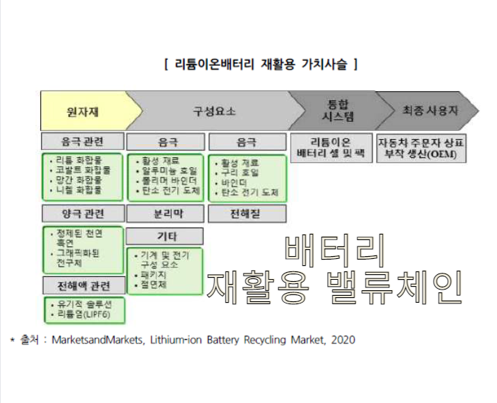 전기차 배터리 밸류체인은 수거 및 검사, 재재조, 전처리, 물질회수 등 총 4단계로 구분이 됩니다. 시장의 성장에 따라 핵심부품 관련 시장도 동반 성장하고 있습니다. 글로벌 시장의 특성상 전기차와 관련 소재에 대한 수요가 폭발적으로 증가하고 있습니다. 따라서 시장과 산업의 성장에 따라 이후 폐배터리의 처리에서 발생하는 문제점들이 이슈가 될 전망입니다. 하지만 원재료의 희소성을 고려하여 판단한다면 시장은 원래 시장의 밸류체인에도 큰 영향을 미칠 것으로 판단됩니다. 이러한 중요성으로 인하여 배터리 시장은 글로벌 기업들 간의 합작회사 등의 회사로 국가 간 기업 간 경쟁과 시너지 활동이 아주 활발하게 진행되고 있습니다. 이에 폐배터리 시장 또한 다시 제조하는 기술과 회수하는 기술로 양분화되어 새로운 밸류 체인을 형성할 것으로 전망합니다. 재활용 산업의 밸류체인은 원자재, 구성요소, 통합시스템, 최종사용자로 총 4단계로 구분이 됩니다. 친환경적인 차원에서의 기술은 전문적인 시장으로 성장하고 있습니다.